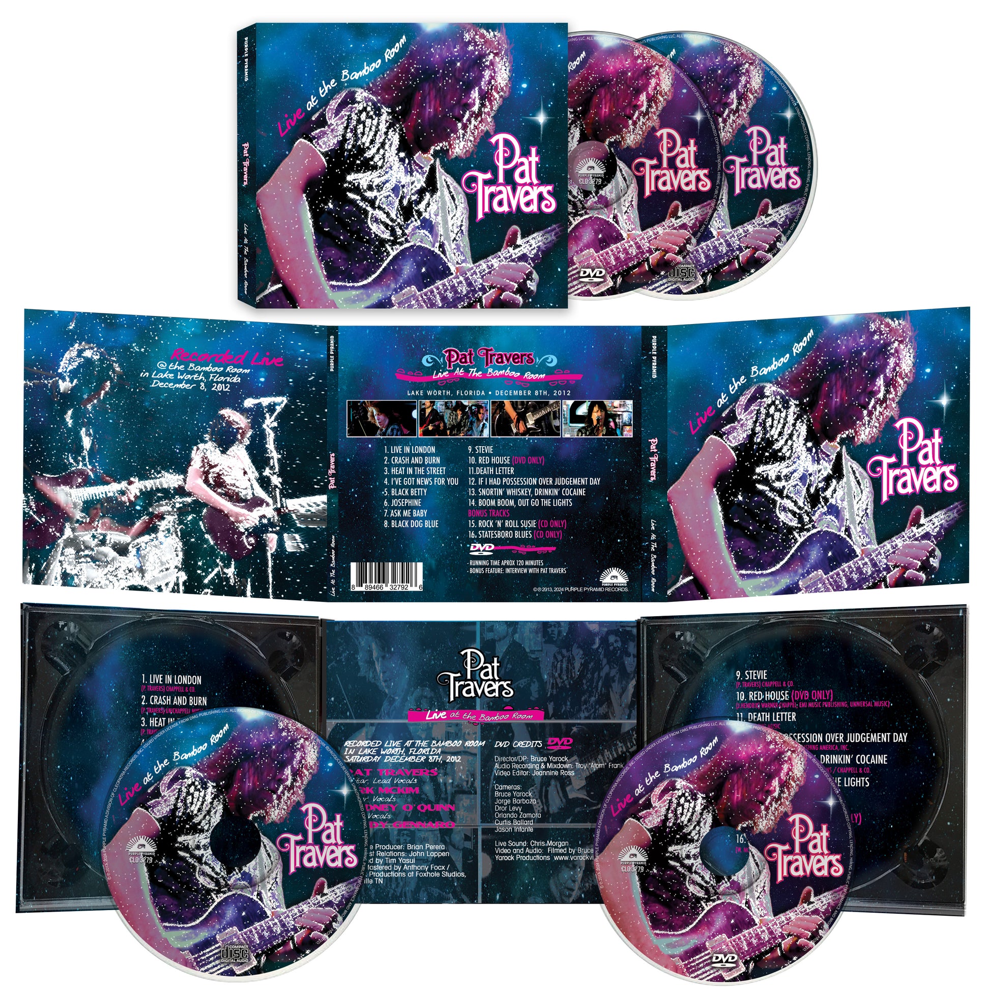 CD - Scheibe 1: 1. Leben in London 2. Absturz und Verbrennung 3. Hitze auf der Straße 4. Ich habe Neuigkeiten für Sie 5. Schwarze Betty 6. Josephine 7. Frag mich, Baby 8. Schwarzer Hund Blues 9. Stevie 10 Todesbrief 11. Wenn ich am Tag des Jüngsten Gerichts Besitz hätte 12. Whisky schnupfen, Kokain trinken 13. Boom Boom, die Lichter gehen aus 14. Rock 'N' Roll Susie 15. Statesboro Blues DVD - Scheibe 2 1. Pat Travers live im Bamboo Room