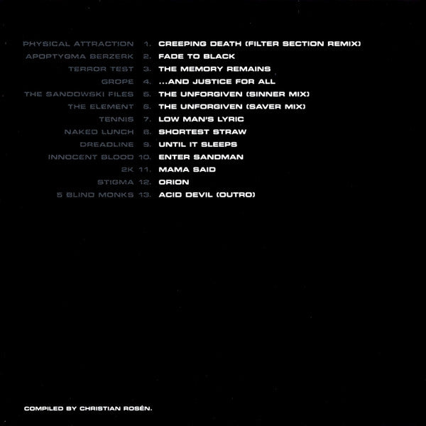 This CD is a must have for Industrial bound head bangers. Apoptymga Beserk does a good job on Fade to Black with a definite techno feel and the rest of the album is very well done. This is a good techno-feel to Metallica. The female vocals for the Unforgiven remixes and Low Man's Lyric is awe-inspiring. So if you are a die hard Metallica fan and a industrial-tech freak, this is a good buy.