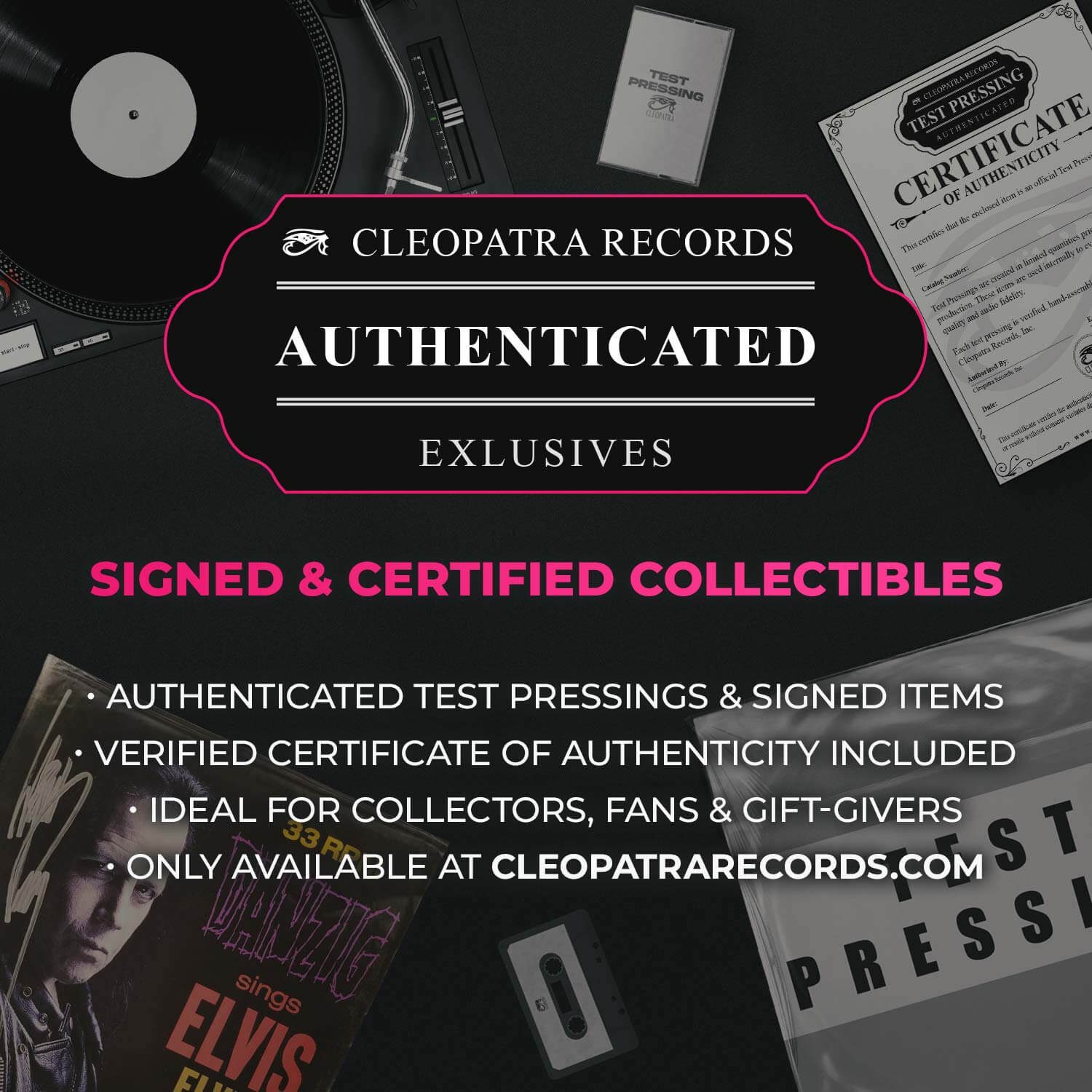Explore Cleopatra Records’ exclusive collection of authenticated music memorabilia - from rare test pressings to signed releases. Each collectible includes a verified Certificate of Authenticity and is only available in extremely limited quantities.